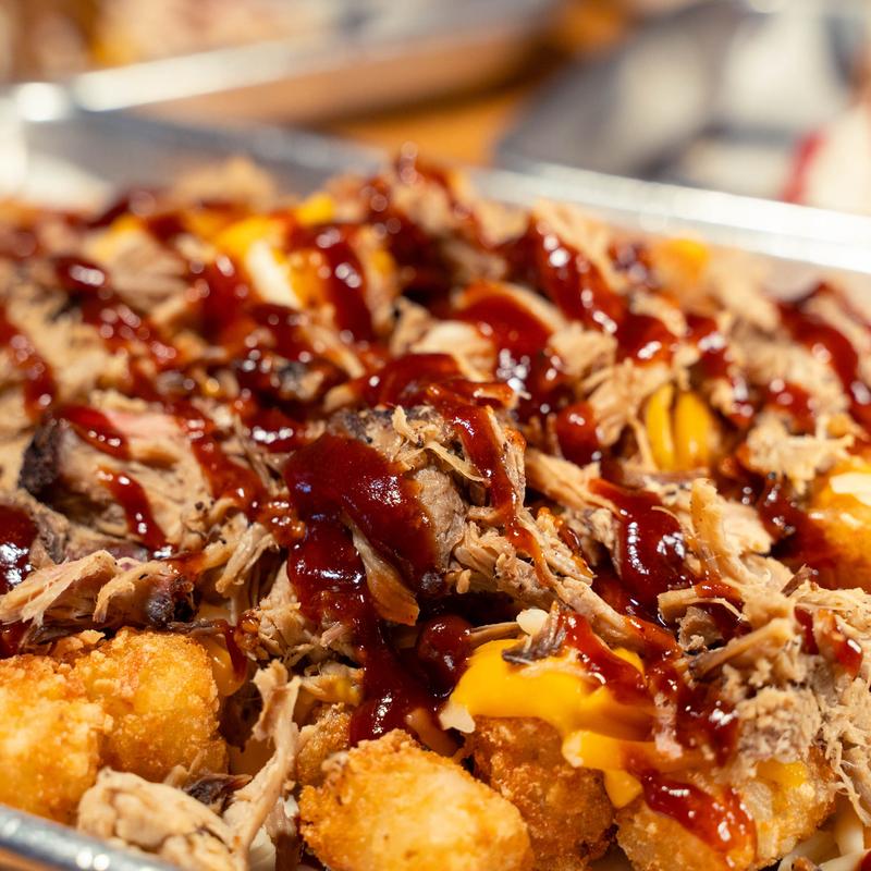 Tater tots loaded with melted cheddar cheese, shredded cheddar jack cheese, smoked chopped pork, and BBQ sauce