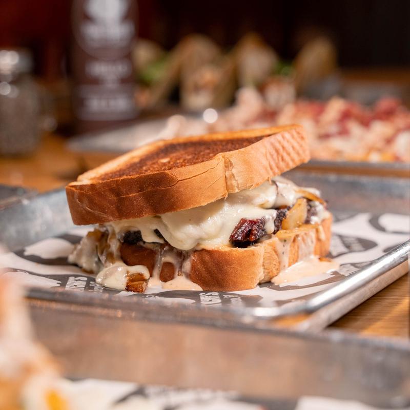 Hamburger patty, chopped smoked brisket, smoked sliced pork belly, cheddar cheese, provolone cheese, and served on a buttered grilled bun