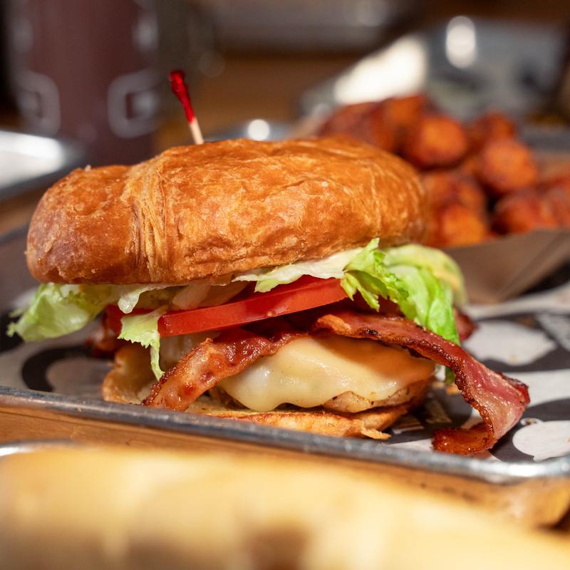 In-house smoked chicken salad made with spicy, sweet hot sauce, cheddar cheese, sliced bacon, fried pickle chips, on a buttered croissant