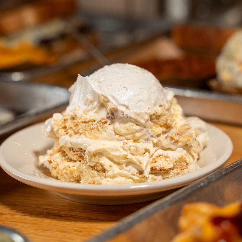 Our homemade pudding is made with cream, bananas, and vanilla wafers