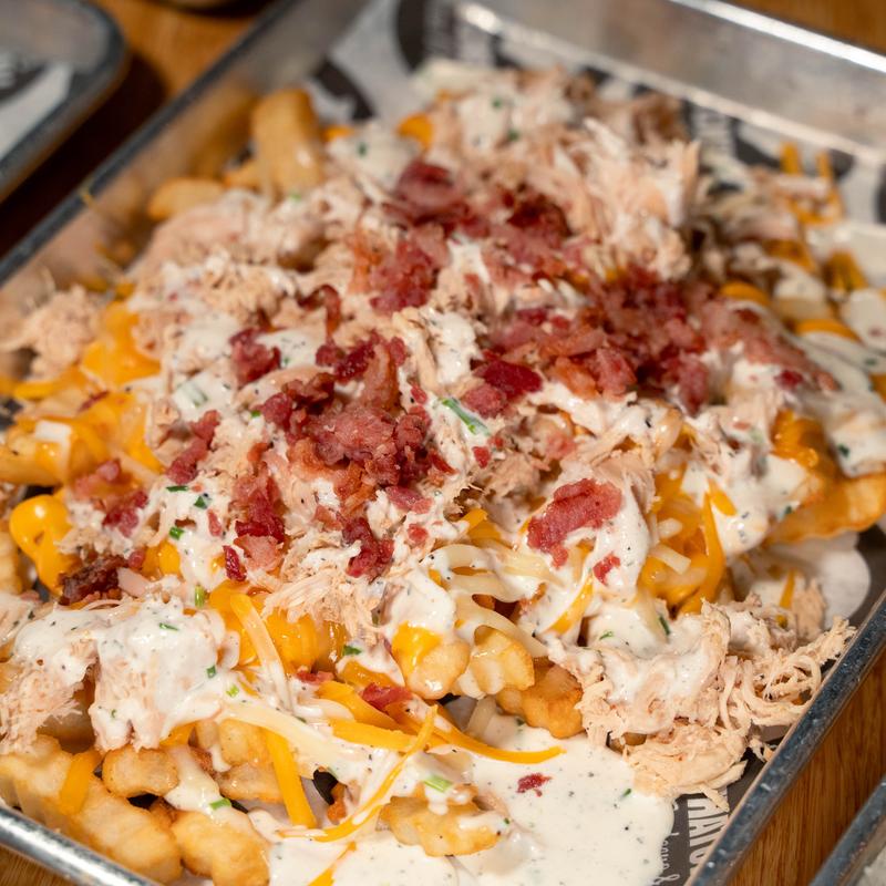 Crinkle cut fries loaded with melted cheddar cheese, shredded cheddar jack cheese, smoked chopped chicken, bacon crumbles, and covered with our in-house ranch