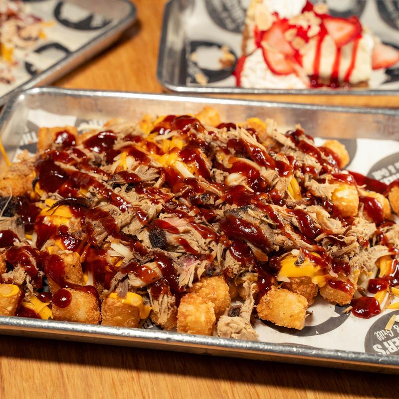 Tater tots loaded with melted cheddar cheese, shredded cheddar jack cheese, smoked chopped pork, and BBQ sauce