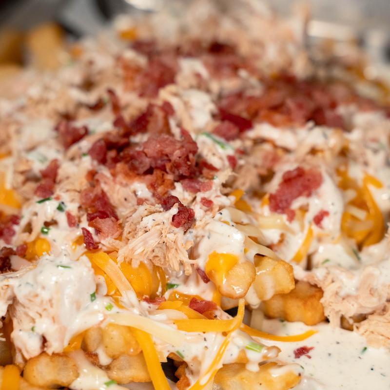Crinkle cut fries loaded with melted cheddar cheese, shredded cheddar jack cheese, smoked chopped chicken, bacon crumbles, and covered with our in-house ranch