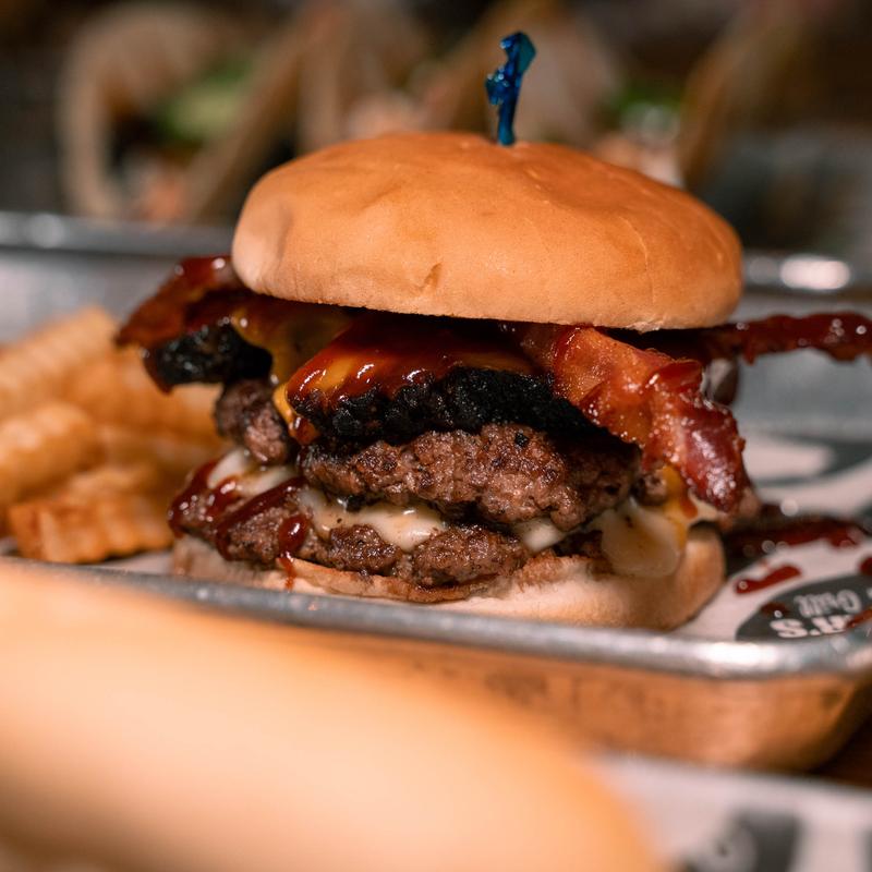 Single $11.00 | Double $13.00 • Hamburger patty, sweet bacon jam, melted smoked gouda, sliced bacon, fried onion petals, and served on a toasted Kaiser bun