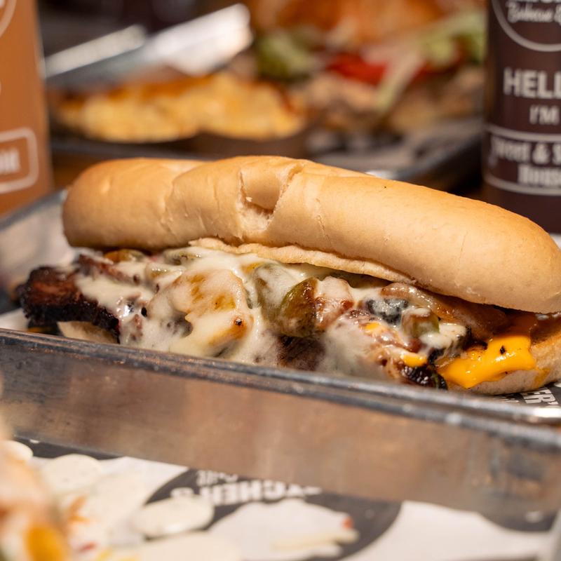 Our smoked sliced brisket, melted cheddar cheese, fire-grilled onions and peppers, melted provolone cheese, served on a toasted sourdough hoagie