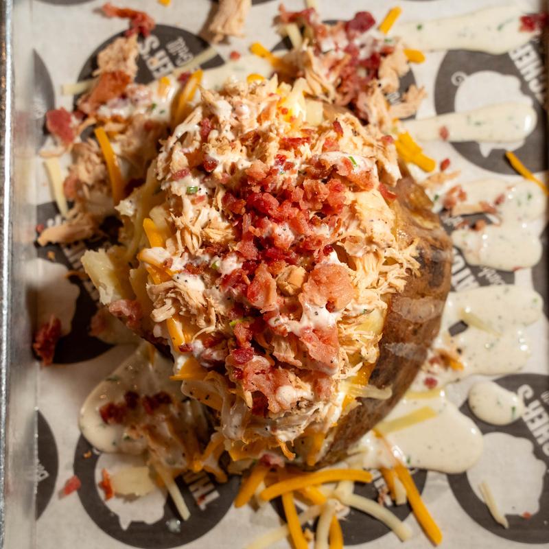 Baked potato loaded with smoked chopped chicken, melted cheddar cheese, cheddar jack cheese, real bacon crumbles, and topped off with our homemade ranch