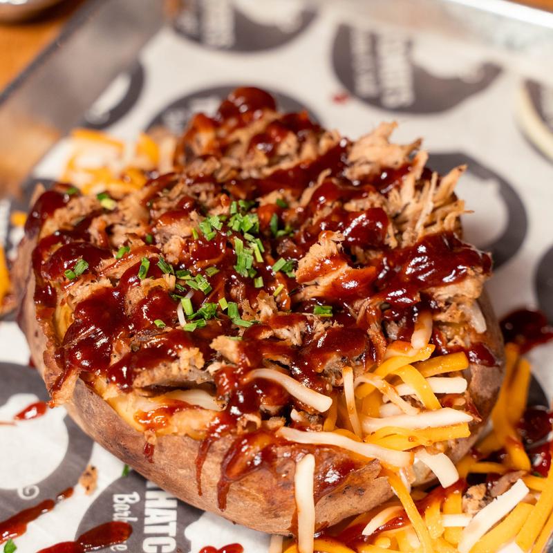 Baked potato loaded with smoked chopped pork or chicken, butter, cheddar jack cheese, chives, BBQ sauce, and sour cream