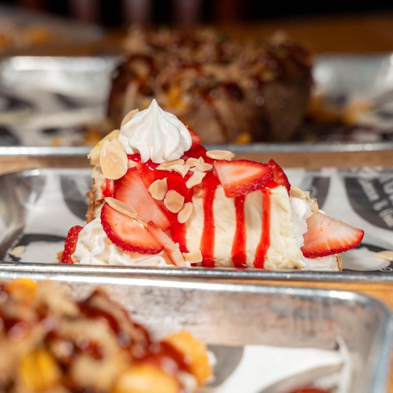 Our in-house made cheesecake covered in fresh strawberries, strawberry sauce, whipped cream, and topped with sugared almonds