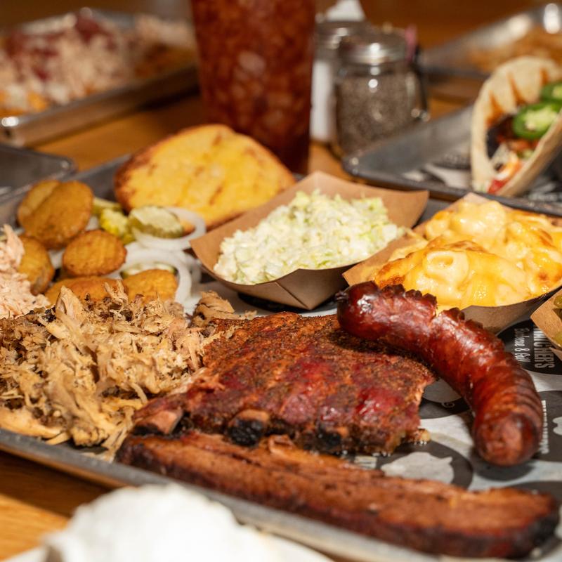 Sampling of our smoked chopped pork, chopped chicken, sliced brisket, ribs, and our smoked spicy sausage