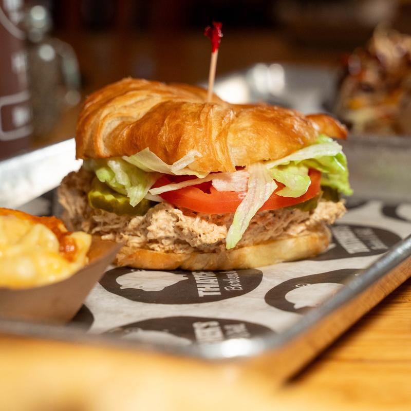 In-house smoked chicken salad made with spicy, sweet, hot sauce, cheddar cheese, sliced bacon, fried pickle chips, buttered toasted croissant