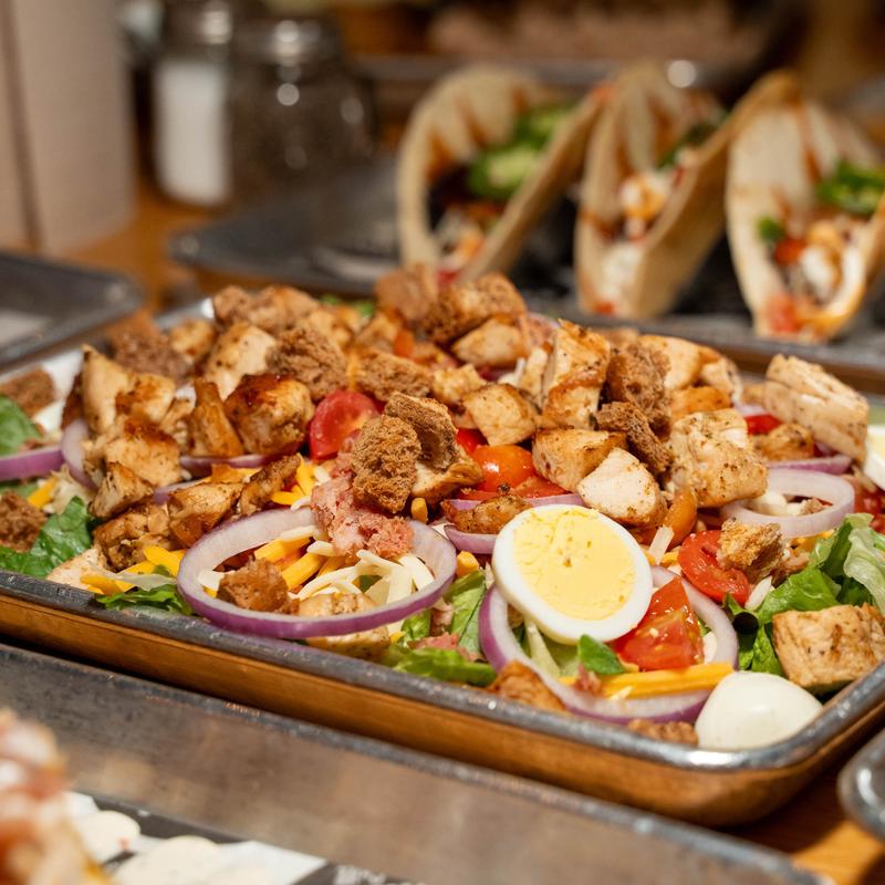 Standard $10.00 | Jumbo 14.00 • Chicken chunks, bacon crumbles, shredded cheddar jack cheese, chopped tomatoes, sliced egg, sliced red onions, roasted sunflower seeds, and our homemade croutons